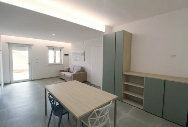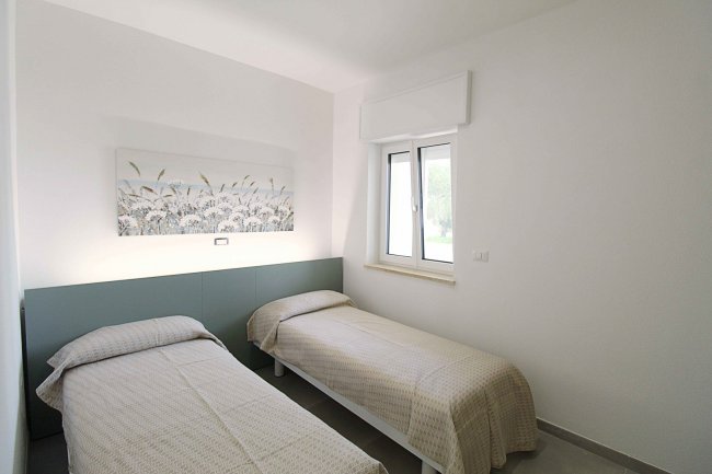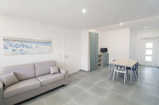 appartamento con aria condionata e tv, ampia area giorno con angolo cottura ben attrezzato, un divano letto doppio, camera da letto matrimoniale, cameretta composta da due letti singoli, bagno con box doccia, veranda antistante l’entrata dell’appartamento e di un balconcino/patio retrostante attrezzato. Arredati in modo semplice e funzionale.